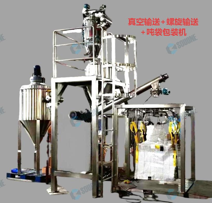 將噸包裝袋套在加料嘴上,將包裝袋四角掛在氣缸上,按動“允加”按鈕,這時壓袋氣缸開始工作并壓住袋口,氣缸將包裝袋四角撐開,控制器將包裝袋重量自動去除,加料螺旋高速轉(zhuǎn)動迅速將物料灌入袋中,隨袋中空氣一起溢出的粉塵通過吸塵器由除塵器吸走,待加料快到設(shè)定值時,加料螺旋進行減速慢加,到設(shè)定值時,加料停止。誤差<0.3%。這時壓袋氣缸松開袋口,氣缸將包裝袋四角松開,將包裝袋送至皮帶輸送機上及時送出。